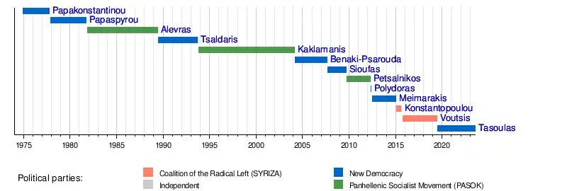 Konstantinos Papakonstantinou | December 9, 1974 | December 12, 1977 | New Democracy | Parliament (Fifth Revisionary) resulting from the 1974 elections | |