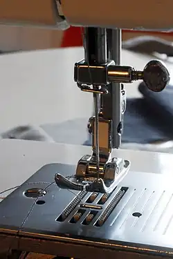 A presser foot is an attachment used with sewing machines to hold fabric flat as it is fed through the machine and stitched. Sewing machines have feed dogs in the bed of the machine to provide traction and move the fabric as it is fed through the machine, while the sewer provides extra support for the fabric by guiding it with one hand. A presser foot keeps the fabric flat so that it does not rise and fall with the needle and pucker as it is stitched. When especially thick workpieces are to be sewn, such as quilts, a specialized attachment called a walking foot is often used rather than a presser foot.
