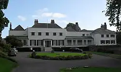 Preston Manor is a two-storey building with a symmetrical Palladian/Georgian façade, now clad in stucco, and a roof laid with Welsh slates.[4][7] The design is characteristic of the mid-18th century, when such symmetrical compositions were fashionable.[4] More space is provided by the basement (in which the remains of the medieval manor house are visible) and the attic, which has dormer windows. The entrance is on the north side and has a five-window range on the main façade. Its east and west wings, added in the 1738 rebuilding, have windows at ground-floor level only (except for a single first-floor window on the east side), and Charles Stanley Peach's additions of 1905 have two- and three-window ranges. All windows retain their original sashes and louvre-style shutters.[7] The hipped roof, with a centrally placed chimney, sits behind a parapet; the side wings have similar roofs. A parapet continues around the roof of the south façade, which has several chimneys at the sides.[7]