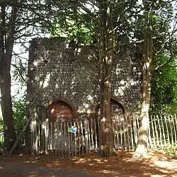 A wellhouse east of the manor house, also a Grade II-listed building, dates from the 1730s. It is now in poor condition, and has lost its original iron pump (operated by a horse) and capstan.[3] The rectangular structure is principally of flint with some red brickwork on the quoins and elsewhere. The east, west and north faces have respectively one, two and three brick-dressed arches (now blocked); the south side cannot be seen. A brick wall surrounds the structure.[22]