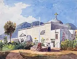 Painting (Circa 1856) by Prince Gaetan, with additions by Giacinto Gigante, of a church and fountain on the Neapolitan Coast