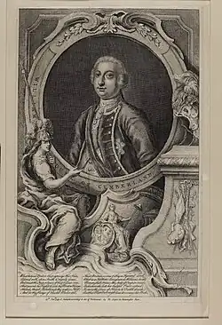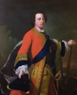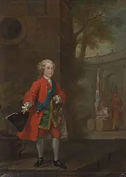 From childhood, he showed physical courage and ability, and became his parents' favourite.[11] He was enrolled in the 2nd Foot Guards and made a Knight of the Bath, when aged four.[12] He was intended, by the King and Queen, for the office of Lord High Admiral, and, in 1740, he sailed, as a volunteer, in the fleet under the command of Sir John Norris, but he quickly became dissatisfied with the Navy,[13] and, instead secured the post of colonel of the First Regiment of Foot Guards on 20 February 1741.[14]