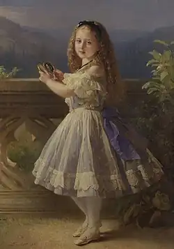 From birth, Beatrice became a favoured child.[6] The elder favourite daughter of Prince Albert, the Princess Royal, was about to take up residence in Germany with her new husband, Frederick ("Fritz") of Prussia. At the same time, the newly arrived Beatrice showed promise. Albert wrote to Augusta, Fritz's mother, that "Baby practises her scales like a good prima donna before a performance and has a good voice!"[7] Although Queen Victoria was known to dislike most babies, she liked Beatrice, whom she considered attractive. This provided Beatrice with an advantage over her elder siblings. Queen Victoria once remarked that Beatrice was "a pretty, plump and flourishing child ... with fine large blue eyes, [a] pretty little mouth and very fine skin".[8] Her long, golden hair was the focus of paintings commissioned by Queen Victoria, who enjoyed giving Beatrice her bath, in marked contrast to her bathing preferences for her other children. Beatrice showed intelligence, which further endeared her to the Prince Consort, who was amused by her childhood precociousness.[6]