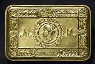 The funding was used to manufacture small boxes made of brass; however, due to metal shortages in the later stages of the war some tins were made from plated base metals or alloys.[6] Each tin was decorated with an image of Mary and other military and imperial symbols along with the names of the UK's then allies.[5] The Princess’s “M” monograph appears to either side of her portrait.[7] The design was by Stanley Adshead and Stanley Ramsey.[5] The words "Christmas 1914" appear on a plaque in the bottom centre of the box with space left above them to allow the owner to carve their name.[8]