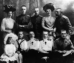 Princess Vera was eight years old when Archduke Franz Ferdinand of Austria was assassinated and World War I broke out, in the summer of 1914. Vera was with her parents and her brother George in Germany visiting her maternal relatives in Altenburg at the start of the war. The conflict took them by surprise, trapping them in Germany, an enemy country. It was thanks to the intervention of the German Empress, Augusta Viktoria of Schleswig-Holstein that they were allowed to return to Russia.[3] Vera's older siblings joined the Russian army in the military effort, and her favorite brother Oleg was killed in action. She was considered too young and was not allowed to attend her brother's funeral. Her brother's death was just the first of many family misfortunes.