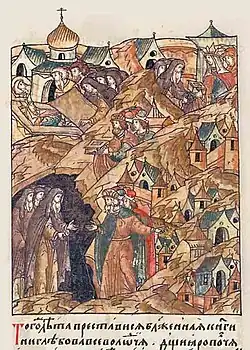 The obituary, which has the style of an encomium,[11] goes on to narrate she was buried in the Assumption Cathedral of the Kyiv Pechersk Lavra, next to her husband in the tomb by the side of father Theodosius of Kiev.[13] The level of detail provided about princess Yaropolkovna of Minsk is unique amongst all obituarities of princesses in the Kievan Chronicle,[7][14] which contains 72 announcements of princely deaths, 60 of which are about men who died as princes (84%), and 12 of them are about women who died as princesses (16%).[14] For example, it is by far the longest obituary, and it is very specific about the time and place of her passing and burial.[15][c] Only 7 out of 12 princesses are given a date of death,[15] only 3 a burial place,[17] and Yaropolkovna is the only one with an exact hour of demise and entombment.[15]