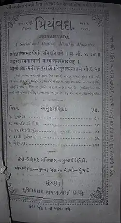 After serving as a deputy educational inspector at Bombay, Manilal was transferred at Bhavnagar as a professor. The contemporary social problem of women's education was of great concern to him and he had prepared a detailed scheme to address this but he was not able to implement it in Bhavnagar. Hence, he decided to establish a journal devoted to women's welfare and education. He started a monthly magazine Priyamvada from August 1885.[1] The cost of an annual subscription was one rupee. Manilal stated the aim of magazine on the first page of first issue:[2]