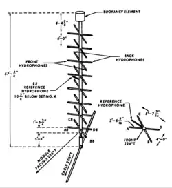 The passive receive array field consisted of ten parallel cables with 210 modules composed of 57 ft (17.4 m) masts mounting hydrophones. The cables were laid down the slope of Plantagenet Bank[note 2] in Bermuda. A 1961 array was to the north east of and parallel to array field string number one and a horizontal string, across the slope, was at right angles to the field at about 3,000 ft (914.4 m).[23] The receiving field was approximately on the sound channel axis laid between 2,000 ft (609.6 m) and 6,000 ft (1,828.8 m).[24][25][note 3]