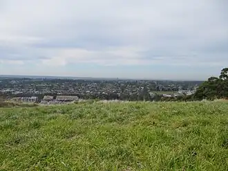 The eroded residue of the volcanic core forms Prospect Hill, which was battered down over millions of years to a small bulge in the generally flat lands of western Sydney.[27][28] The dome is referred to as a doleritic laccolith.[29] The next stage of natural development, which has lasted over 60 million years, has been the slow erosion of the overlying layers of sedimentary rock by the flow of rainwater, which eventually laid bare the edges of the volcanic and metamorphic rocks of the intrusion.[30][31] The hill contains a slender, chilled margin of fine-grained basalt with most of the mass of the intrusion being made up of picrite and dolerite. Volcanic rocks on the hill are predominantly mafic. Minerals, and as well as volcanic material. In the 1960s, small amount of gold was discovered in a sample test, and since then no more has been found.[32]