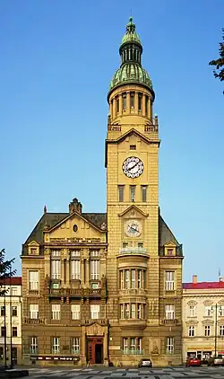 The historic centre is formed by the T. G. Masaryka Square and its surroundings, which include several other smaller squares. The central square is lined by burgher houses with Renaissance or Baroque cores, and facades mostly from the 19th and 20th centuries. One of the houses is the birthplace of Jiří Wolker, one of the most important natives. The landmark of the square is the city hall from 1911–1914 with a 66 metres (217 ft) high tower, which is open to the public.[12] In the middle of the square is a Baroque Marian column from 1714.[13]