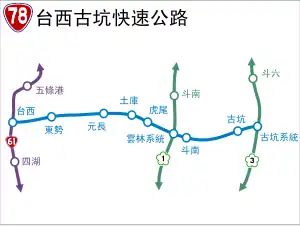 Provincial Highway 78 (Chinese: 台78線) begins in Taixi, Yunlin, Taiwan, on Zhonghua Road (Provincial Highway No. 17) and ends in Gukeng, Yunlin on National Highway No. 3.