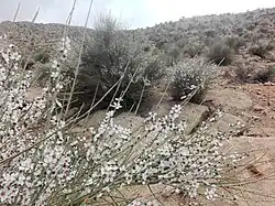 It prefers to grow in arid or semiarid areas at 500 to 2700 m above sea level. A full genetic and morphological analysis suggests that Prunus scoparia may be conspecific with it; certainly it is its closest relative.[4] It is occasionally cultivated for erosion control, as its brushy growth form makes a good windbreak.[5][6]