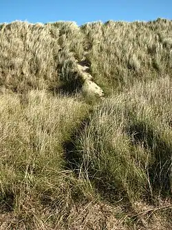 The second stage in a psammosere succession. Humans have trampled some of the grass in this area, making it more vulnerable to erosion.