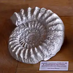 Fossil of Pseudopeltoceras chauvinianum from France, on display at Galerie de paléontologie et d'anatomie comparée in Paris