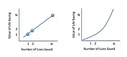 Paul Slovic, a prominent psychologist in the realm of risk, maintains the original interpretation posited by Lifton. Slovic's article, "Psychic Numbing and Mass Atrocity", returns to the collectivist model and most notably confronts the value of saving a human's life. The figures to the right denote both arguments for the hypothesized value of saving a human's life as well as the true value of saving a human's life established through Slovic's empirical research.[1][2] Slovic introduced the concept of psychophysical numbing, which is the diminished sensitivity to the value of life and an inability to appreciate loss.[2] Essentially, the proportion of lives saved is more important than the number of lives saved.[2] One of Slovic's arguments for this outcome is that people suffer from innumeracy and cannot comprehend the emotional connotation associated with large numbers. The threshold, as stated by Slovic, where people cannot comprehend the emotional magnitude of the loss of life is two, as shown in the figure. Paul and researchers say findings can be summarized with "The more who die, the less we care."[2][9]
