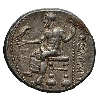 A coin of Ake (later Ptolemais), depicting Zeus and bearing the Phoenician legend 𐤏𐤊 (ʿK), from the coinage of Alexander the Great