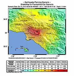 The 5.1 Mw 2014 La Habra earthquake occurred on March 28, 2014, at 9:09:42 p.m. on the Puente Hills Fault and was centered 1 mile east of La Habra, California. It had a maximum Mercalli intensity of VII (Very strong) and caused a total of $10.8 million in damage.[6][7]