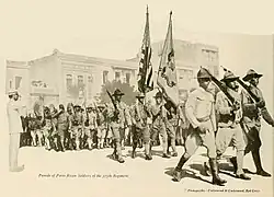 Puerto Rico became a US Territory in accordance with the 1898 Treaty of Paris which ended the Spanish–American War. The United States appointed a military governor and soon the United States Army established itself in San Juan. The Army Appropriation Bill created by an Act of Congress on March 2, 1899 authorized the creation of the first body of native troops in Puerto Rico. On June 30, 1901, the "Porto Rico Provisional Regiment of Infantry" was organized. On July 1, 1901, the United States Senate passed a Bill which would require a strict mental and physical examination for those who wanted to join the Regiment. It also approved the recruitment of native Puerto Rican civilians to be appointed to the grade of Second Lieutenants for a term of four years if they passed the required tests.[17] An Act of Congress, approved on May 27, 1908, reorganized the regiment as part of the "regular" Army. Since the native Puerto Rican officers were Puerto Rican citizens and not citizens of the United States, they were required to undergo a new physical examination to determine their fitness for commissions in the Regular Army and to take an oath of US citizenship with their new officer's oath.[18]
