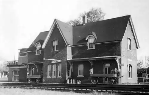 It is built of brick and is described as "restrained gothic style, two stories, cross gable roof with 6 hip gable dormers and decorative faces".[1] The railway station was listed on September 11, 1996, as a Municipally Registered Property under the Heritage Property Act, and as a Provincially Registered Property under the same statute in 2009.[3][6][4] The Pugwash railway station is one of only two stations designed by Fleming still standing in Nova Scotia.[7] The station is also famous for its part in the Thinkers Conference. Pugwash native Cyrus Eaton used the station to transport and house those who attended conference.[8]