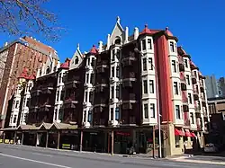 Ruthven Mansions, at 15−17 Pulteney Street (and occupying 1−7 Austin Street), is a large residential building, with commercial premises on the ground floor. It was built in two stages, in 1911–12 and 1915, for London investor Ruthven Frederic Ruthven-Smith, with the first stage designed by local architects Black and Fuller and built by A. R. Maddern and Son. Built as luxury apartments, it included automated vacuum cleaning, automated doors, mechanical ventilation, electric light and an electric lift. Stage one comprised 12 apartments, with an additional five storeys, comprising 28 apartments, added by builders W. C. Torode in 1915. The building is considered a good example of residential Gothic Revivalist and Art Nouveau architecture. Prominent inhabitants included members of the Kyffin Thomas family, proprietors of the South Australian Register, and William Alfred Webb, Commissioner of the South Australian Railways[16][17] from 1922 to 1930.[18]