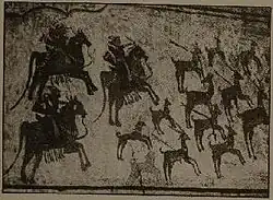 Fresco depicting a hunting scene from a Punjabi Muslim khangah (Khangah Dargani Shah at Dhun Dhaewal) located on the right bank of the Beas River near Chola Sahib, Tarn Taran district