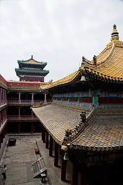 The Putuo Zongcheng Temple (Chinese: 普陀宗乘之庙; pinyin: Pǔtuó Zōngchéng zhī miào, Tibetan: གྲུ་འཛིན་་་བསྟན་པའི་རྩ་བའི་ལྷ་ཁང༌།, Wylie: Chunzin Dainbaiza Pailhakang) of Chengde, Hebei province, China is a Qing dynasty era Buddhist temple complex built between 1767 and 1771,[1] during the reign of the Qianlong Emperor (1735–1796). It is located near the Chengde Mountain Resort, which is south of the Putuo Zongcheng. Along with the equally famed Puning Temple, it is one of the Eight Outer Temples of Chengde. The temple was modeled after the Potala Palace of Tibet, the residence of the Dalai Lama built a century earlier.[1][2] Since it was modeled after the Potala palace, the temple represents a fusion of Chinese and Tibetan architectural styles. The temple complex covers a surface area of some 220,000 square metres (2,400,000 sq ft), making it one of the largest in China. Many of its halls and pavilions are adorned with copper and gold tiled roofs, adding to the splendor of the site.