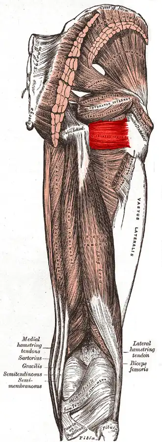 The quadratus femoris is a flat, quadrilateral skeletal muscle. Located on the posterior side of the hip joint, it is a strong external rotator and adductor of the thigh,[2] but also acts to stabilize the femoral head in the acetabulum. The quadratus femoris is used in Meyer's muscle pedicle grafting to prevent avascular necrosis of femur head.