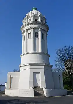 At the north-west corner is Pennant Lodge, once the home of Charles Freshfield. Also to the north-west of the park itself, on Queen's Park Road, stands the Pepper Pot (also called the "Pepper Box"). Probably originally built as a horizontal wind-powered water pump, and later used for the publishing of a local newspaper, it was later an artist's studio and by the 1990s a public convenience. In the 21st century it has been sealed and unused.[1][2] The park itself, without the houses but including the Spa and the Pepper pot, was bought by the Race Stand Trustees in 1890 for £13,500 and donated to the town.[1]