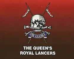 The regiment's nickname, the 'Death or Glory Boys', came from their cap badge and was known as "the motto".[4] This was the combined cap badges of the two antecedent regiments, and features a pair of crossed lances, from the 16th/5th Queen's Royal Lancers, together with a skull and crossbones, below which is a ribbon containing the words 'Or Glory'. This comes from the 17th/21st Lancers, and was the cap badge of the 17th Lancers (the original 'Death or Glory Boys').[1]