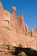 Queen Nefertiti Rock is a 4,741-foot-elevation (1,445-meter) pillar in Grand County, Utah. The feature is located within Arches National Park and like many of the rock formations in the park, Queen Nefertiti Rock is composed of Entrada Sandstone. Topographic relief is significant as the summit rises 400 feet (122 meters) above the Park Avenue Trail in 0.1 mile (0.16 km). Precipitation runoff from Queen Nefertiti Rock drains to the nearby Colorado River via Courthouse Wash. This landform's descriptive toponym has been officially adopted by the United States Board on Geographic Names,[1] and is so named because the feature resembles the head of Queen Nefertiti.[4][6]