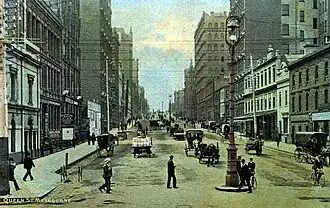 Queen Street is a street in the Melbourne central business district, Victoria, Australia. The street forms part of the original Hoddle Grid and was laid out in 1837.[1] It runs roughly north-south and is primarily a commercial and financial thoroughfare of the central business district.
