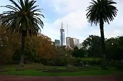 The view from the Queen Victoria statue towards the Victorian Arts Centre