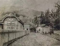 The station opened in November 1862.[4] By March 1863 more than 1000 people lived in the town and the police force consisted of an Officer, a Foot Sergeant, a Mounted Constable, eight Foot Constables, a Detective and four horses. There were also police officers at Arrowtown (7), Frankton (1), Arthurs Point (2) and Maori Point (1).[5] The Gold Escort was distinct from the police; contracted to Cobb and Co. Near Skippers and along the Shotover, branch escorts transported prisoners who were shackled to posts halfway along. The escort troopers were armed with carbines and swords. The Otago Daily Times reported that robberies were numerous and frequent drunkenness prevalent, with pick-pocketing complaints common. Claim jumping and stick-ups were also common. In 1867 there were police stations at Queenstown, Arrowtown, Frankton, Skipper's, Maori Point, Nevis, Nokomai and Cardrona.[6]