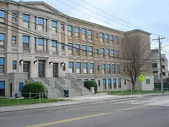 The now-demolished 1924 building of Quincy High School; the new school is to the right of the photo, in the place of the now-demolished Vocational Center depicted.