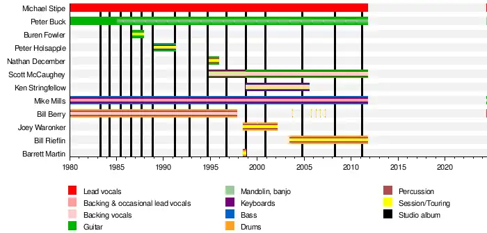 R.E.M. was an American alternative rock band formed in Athens, Georgia, in 1980 by drummer Bill Berry, guitarist Peter Buck, bassist Mike Mills, and lead vocalist Michael Stipe, who were students at the University of Georgia. R.E.M. was noted for Buck's arpeggiated "jangle" guitar playing; Stipe's distinctive vocal style, unique stage presence, and cryptic lyrics; Mills's countermelodic bass lines and backing vocals; and Berry's tight, economical drumming. In the early 1990s, other alternative rock acts such as Nirvana, Pixies, and Pavement named R.E.M. as a pioneer of the genre. After Berry left in 1997 due to health issues, the remaining members continued with mixed critical and commercial success. The band broke up amicably in 2011, having sold more than 90 million albums worldwide and becoming one of the world's best-selling music acts.