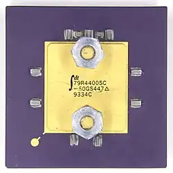 NEC marketed their version as the VR4400. The first version, a 150 MHz part, was announced in November 1992. Early versions were fabricated in a 0.6 μm process.[5] In mid-1995, a 250 MHz part began sampling. It was fabricated in a 0.35 μm four-layer-metal process.[6] NEC also produced the MR4401, a ceramic multi-chip module (MCM) that contained a VR4400SC with ten 1 Mbit SRAM chips that implemented a 1 MB secondary cache. The MCM was pin-compatible with the R4x00PC. The first version, a 150 MHz part, was announced in 1994. In 1995, a 200 MHz part was announced.