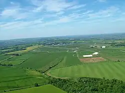 RAF Little Rissington officially opened in 1938, comprising the domestic site and a grass airfield.[2] During 1942, three asphalt runways were laid.[3] Extra land was added to accommodate Sites A to E. Later in the war, the main runway 05/23 was extended northerly (later to become the main runway for instrument landings), 09/27 and 14/32 were extended easterly and south-easterly respectively.[4]