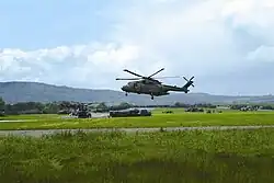 In 1971, part of the airfield was again taken over by the Royal Navy for use in assault helicopter training and exercises that would not conflict with fixed-wing traffic on the Navy's other stations. Merryfield was soon subject to naval tradition by being labelled RNAS Merryfield (HMS Heron II)[7] (IATA: N/A, ICAO: EGDI). In the event, the Navy's occupation proved to be the most enduring of the airfield's half century of existence, for it was still being used by its helicopters.[6]