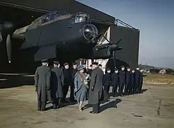 HM Queen Elizabeth inspects flight and ground crews at RAF Warboys, February 1944, in front of an Avro Lancaster of No. 156 Squadron RAF