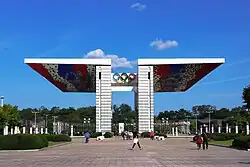 At the World Peace Gate in Seoul, teams had to stack blocks to form a domino chain.