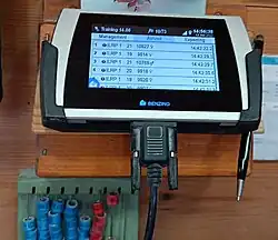 The latest development and preferred method for timing racing pigeons is the Electronic Timing System. The bird's arrival is recorded automatically. When using an electronic system, the pigeon fancier does not even have to be at the loft to clock the birds as they return.[11] Birds are fitted with a band that has a tiny RFID chip in it which can be read when the bird comes home. At the home loft the electronic scanning records the pigeons' arrival. The pad or antenna is placed at the entry point to the loft entrance and as the pigeon crosses it the electronic band is scanned. The clock is attached to the antennas. The serial number of the transponder ring is recorded along with the time of arrival. This is very similar to transponder timing systems used in human races.[12]