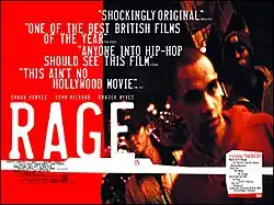 Rage is a 1999 feature film directed and written by Nigerian-born Newton Aduaka. Rage is his debut feature. Fraser Ayres stars as Jamie, also known as Rage, a mixed-race, angry youth living on a grim council estate in South London. He is part of a rap trio with his two friends Godwin (Shaun Parkes) and Thomas (John Pickard). Looking to escape through their music, they turn to crime in order to finance making a record.