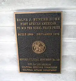 Bunche was born in Detroit, Michigan and later lived in Albuquerque, New Mexico, but moved to Los Angeles to live with his maternal grandmother when his mother died in 1917. Bunche and his sister, Grace, were raised at the house on 40th Place by their grandmother, Lucy Taylor Johnson, their two aunts (Nelle and Ethel), and their uncle Thomas Johnson.[2] While living in Los Angeles, Bunche became the valedictorian at both Jefferson High School, one-half block away, and UCLA, then located at Vermont Avenue and Melrose. Bunche was also a star basketball player while at UCLA.[3] Bunche won the 1950 Nobel Peace Prize for his work in negotiating and drafting the 1949 Armistice Agreements that ended the 1948 Arab-Israeli War.[4] He was the first person of color from any country to receive the Nobel Peace Prize.[5]