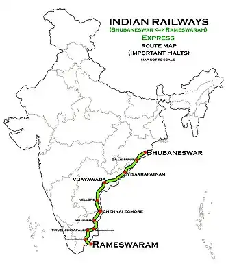 The 18495 / 96 Rameswaram–Bhubaneswar Express runs from Rameswaram via, Manamadurai Junction, Sivaganga, Devakottai Road, Karaikkudi Junction, Tiruchirappalli Junction, Thanjavur Junction, Kumbakonam, Viluppuram Junction, Chennai Egmore, Vijayawada Junction, Visakhapatnam, Bhubaneswar.