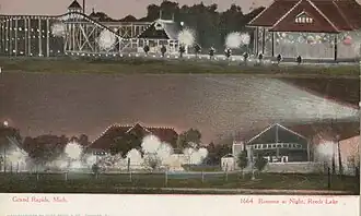Ramona Park was located on the west shore of Reeds Lake in East Grand Rapids, Michigan, and owned and operated by the Grand Rapids Street Railway Company, a trolley park.[2] By 1921 the Ramona Amusement Corporation was formed and managed by the Railway Company. Trolley parks were common in the United States from the late 1800s into the mid twentieth century. Local transportation companies received fares for patrons riding the trolleys and also park admittance fees. A good example of a trolley park is Coney Island.