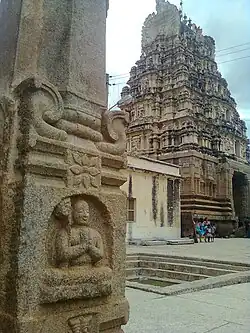 The temple has an imposing tower over the entrance gate (gopura) and two large concentric rectangular enclosures (prakara) around its perimeter. The entrance to the inner sanctum (garbhagriha) is through multiple columned halls (mantapa).[6] A vestibule (sukhanasi), hall (navaranga or just mantapa) and a front hall (mukhamantapa) are the other main structures in the temple. The roof of the mukhamantapa is decorated with a "garland" ("hara") of miniature decorative towers (called "kudu" and "sala" shikharas) whose niches contain stucco images of the god Vishnu.[4]