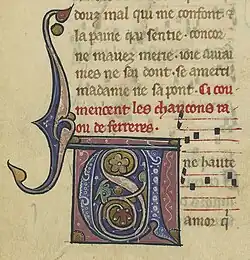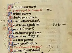 • J'ai oublié paine et travaus (RS389): listed as no.8 in the index of TrouvM and copied in eight position (of 9 songs) in Trouv M fol.84v, like RS2036 these two attributions in the index and body of TrouvM are the sole ascription of this widely copied song to Raoul. This time the KNPX group witnesses all ascribe the song to Gace Brulé while TrouvC fol.97v gives it to Andreus de Paris. The song is found anonymously in four further manuscripts: Trouva fol.27v; TrouvL fol.50r; TrouvO fol.67r; and TrouvV fol.30v. Huet's edition of Gace did not include this song.[6] Rosenberg and Danon do include it, but make it clear that it sits right at the limit of their willingness to ascribe songs to Gace.[7]
