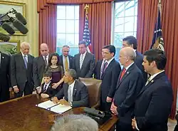 Ruiz and a group of bipartisan lawmakers join President Obama at the bill signing of the Kids First Research Act in the Oval Office, 2014