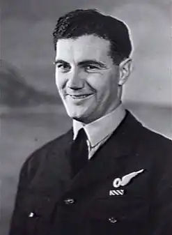 During the war he served as a warrant officer and in 1943 was awarded a Distinguished Flying Cross, along with his pilot Arthur Simpson (408881), for their efforts in a bombing operation over Germany.[9] They were flying over Hanover on a Lancaster bomber when the airscrew of a German night fighter tore a hole under the plane's nose, which resulted in the plane falling 3000 feet. Despite this, they were able to recover and still achieve their objectives in dropping the bombs at their target.[10]