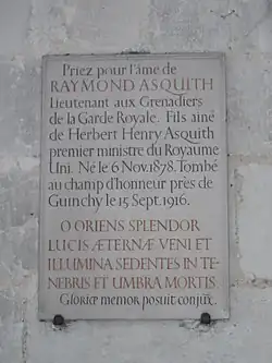 Priez pour l'âme de RAYMOND ASQUITH Lieutenant aux Grenadiers de la Garde Royale. Fils ainé de Herbert Henry Asquith premier ministre du Royaume Uni. Né le 6 Nov. 1878. Tombé au champ d'honneur près de Guinchy le 15 Sept. 1916. [Pray for the soul of RAYMOND ASQUITH Lieutenant of the Grenadiers of the Royal Guard. Eldest son of Herbert Henry Asquith, prime minister of the United Kingdom. Born Nov. 6 1878. Fell on the field of honour near Guinchy Sept. 15 1916.]